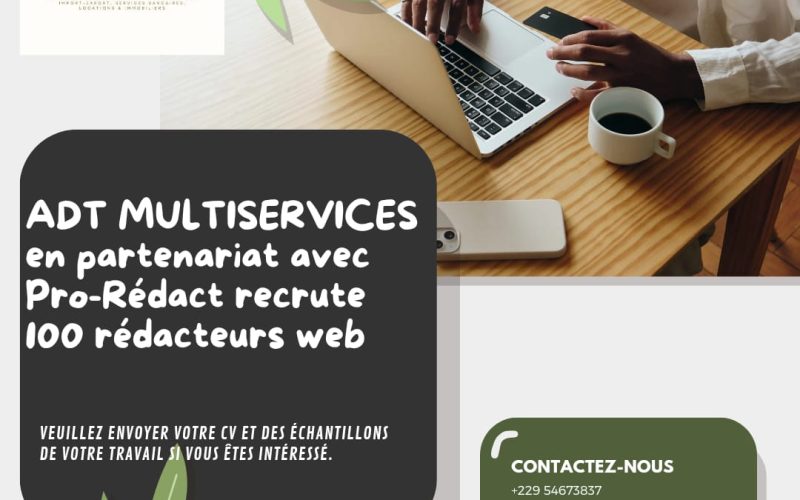 Si vous êtes passionné(e) par la rédaction web et souhaitez rejoindre une équipe dynamique, veuillez envoyer votre CV et des échantillons de votre travail à l’adresse adtmultiservicessarl@gmail.com