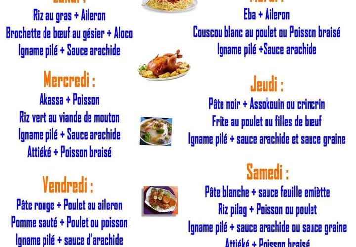Pâte blanche + sauce feuille emiètte Riz pilag + Poisson ou poulet Igname pilé + sauce arachide ou sauce graine Attiéké + Poisson braisé